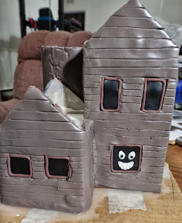 I used heavy cardboard for the base and to cut out the shapes of the house. For the tower I used the tube from a roll of paper towels. Everything was securely taped and glued together and then I wrapped the whole thing in black clay to make one solid piece and to make the windows look dark when I cut them out. After I baked that it was easier to apply the walls of the house. I cut out windows and the door and framed them with thin strips of clay.